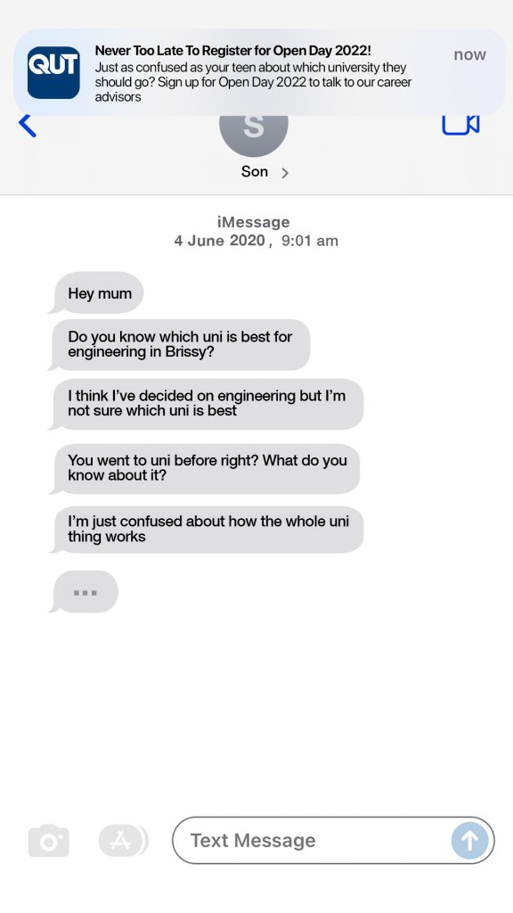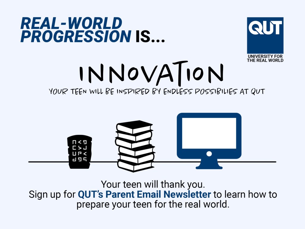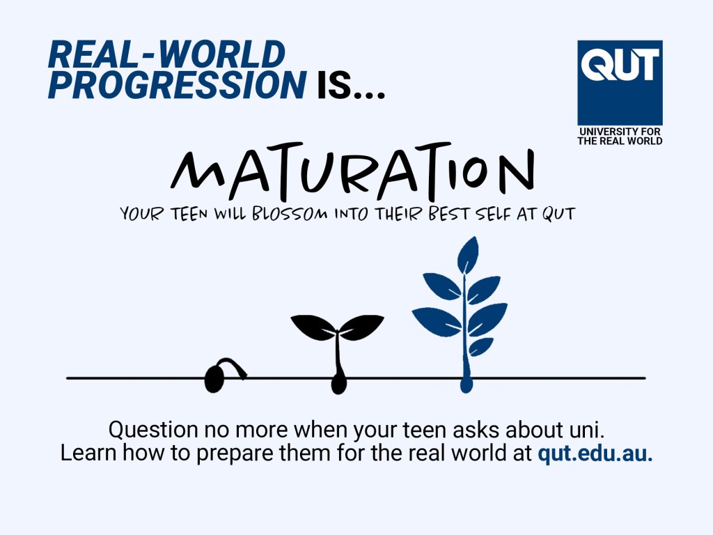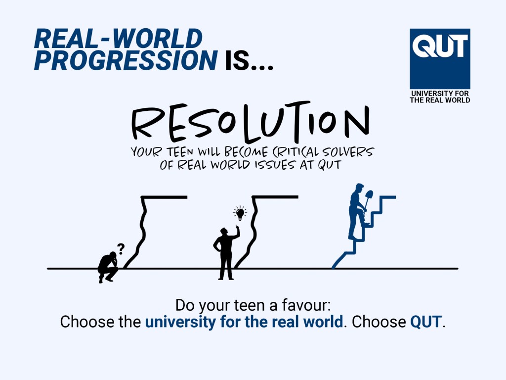 Strategy: To create need by revealing parents’ dissonance of wanting to help their teen but having limited knowledge to do so, then to provide a solution by presenting parents with information about QUT and its advantages