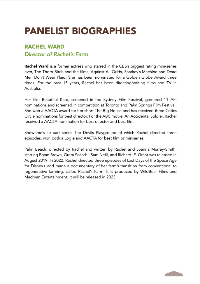 Rachel’s Farm is a Madman Entertainment documentary by Australian film director and actress, Rachel Ward, about her journey towards restoring Australia’s farmland, food, and climate. Leading up to its release, NIXCO organised QnA preview screening sessions in at least 12 locations across Australia. To assist with this, I designed an info pack for each location that introduces the film, Rachel Ward, and the QnA panellists.